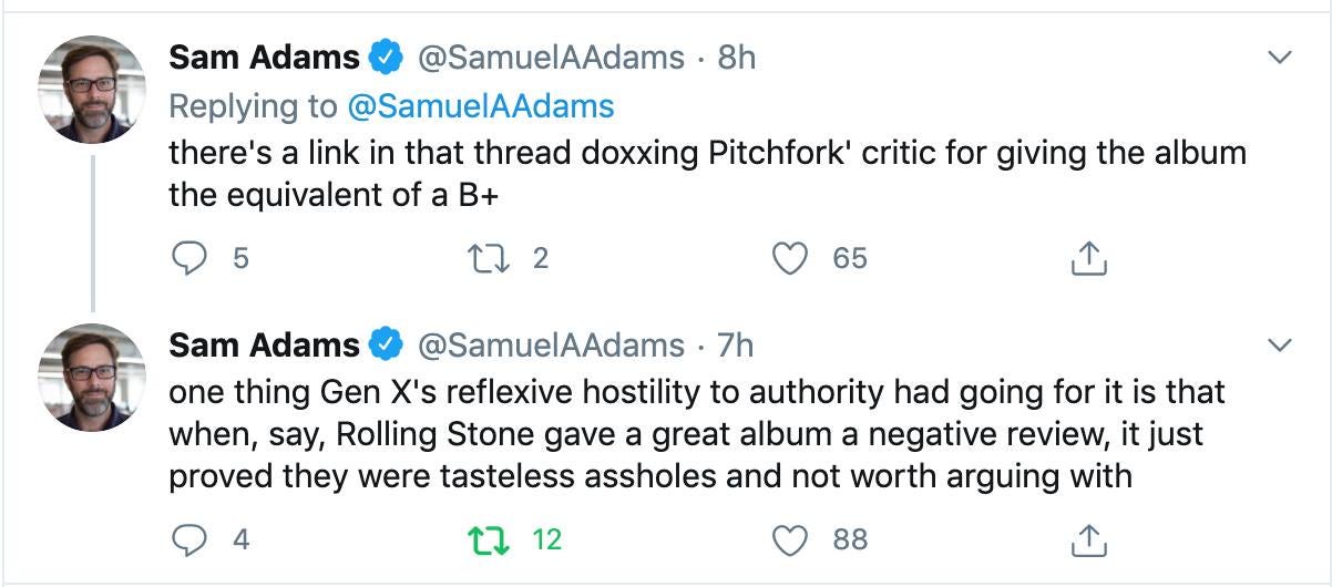 This lack of regard used to be one of those things we mostly shrugged off. It went hand in hand with our innate disregard for so-called authority figures and opinion havers. This “reflexive hostility,” as Sam Adams (not that one) calls it, marked one of the first real tectonic breaks in generational consistency: