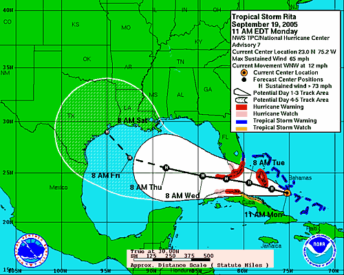 We were also part of the (net) mass exodus from Houston in the runup to Hurricane Rita. That storm was, at the time, the most intense hurricane ever recorded in the Gulf of Mexico (it’s now tied with Milton), and as you can see from the NHC graphic below, they had it targeting Houston from the jump.