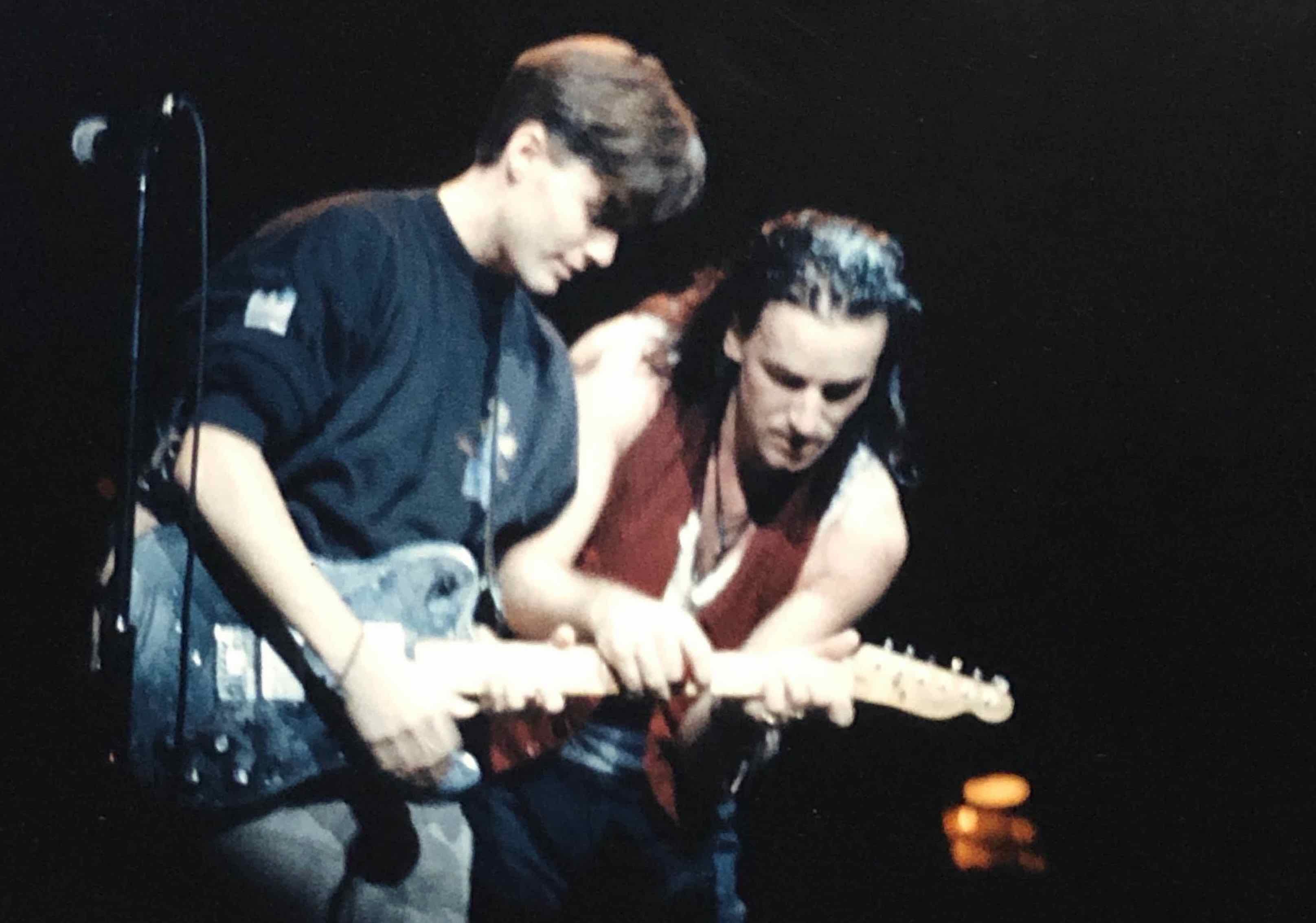 They played a decent chunk of The Joshua Tree, of course (though not one of my favorites, “Red Hill Mining Town”), “I Will Follow,” “October” (for some reason), and a cover of “People Get Ready,” where he asked someone from the audience to help play. It was a kid named Scott (pictured above), and I remember him sending a letter into the Daily Texan (the UT paper) a couple days later asking if anyone had gotten a picture. I guess they did.